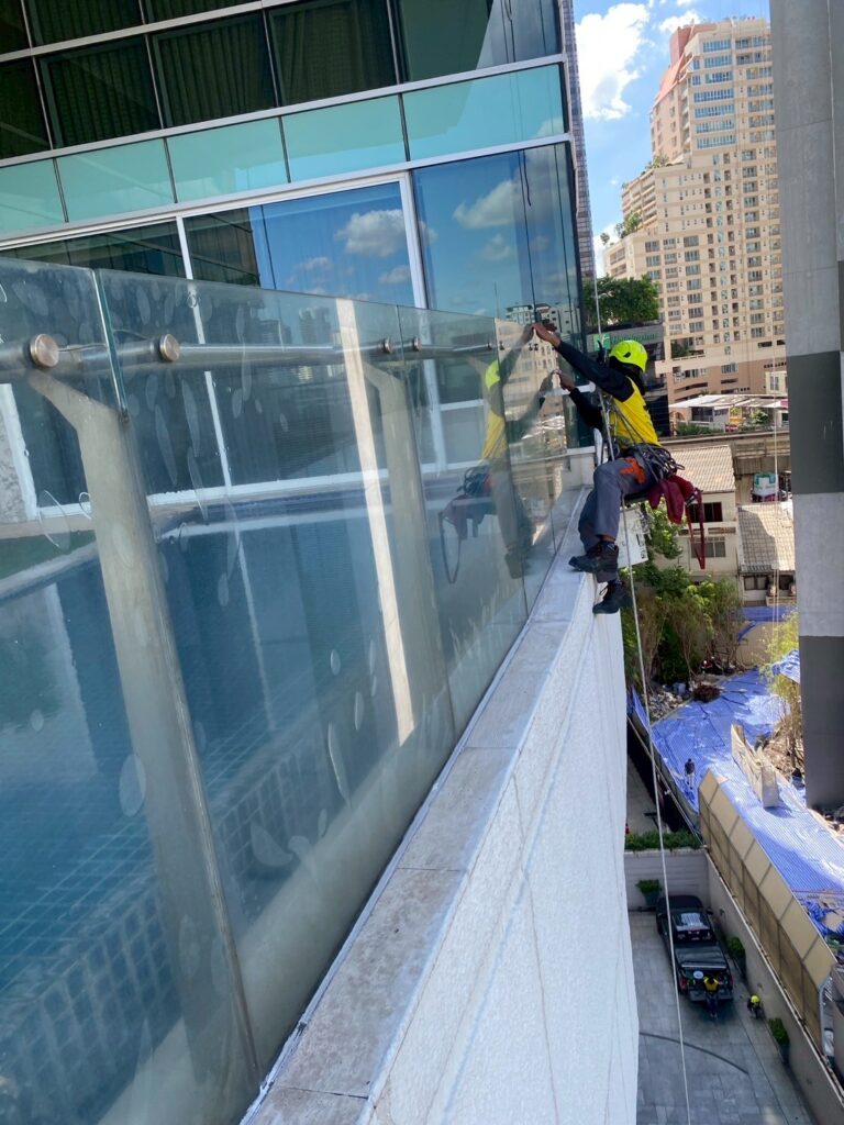 ทีมงานช่างกระจกมืออาชีพ พร้อมทีมโรยตัวสำหรับงานสูง